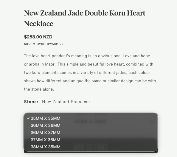 Each pounamu piece is carved from a unique stone, meaning no two items look exactly the same even if the shape is identical. To showcase this individuality, I designed an improved variant selector on the product page that lets users browse each stone option, zoom in on details, and choose the exact piece they want. This approach not only highlights the natural variation but also creates a more intuitive and satisfying selection experience.